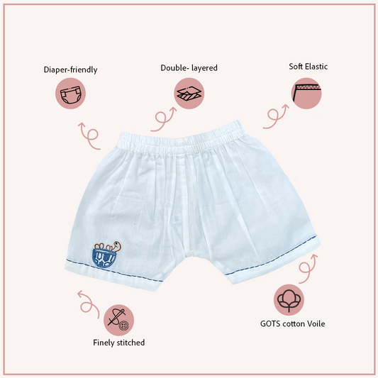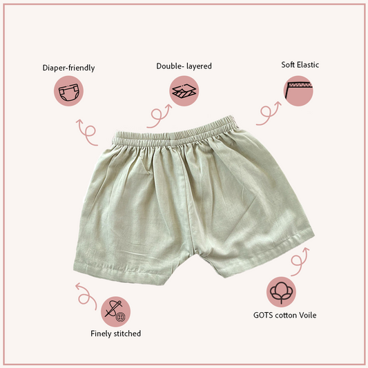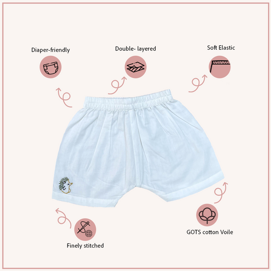 Diaper-friendly fit for newborns and toddlers in organic cotton voile.