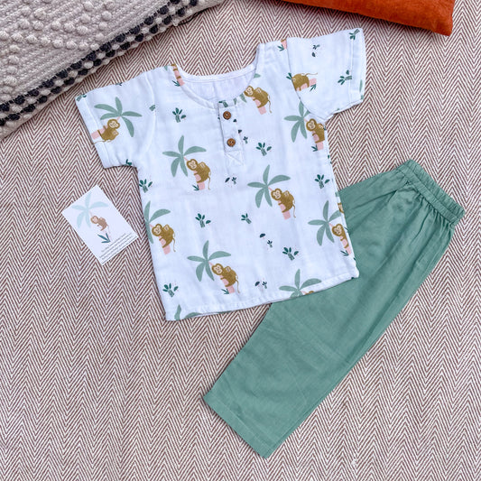 Muslin Full Sleeves Jhabla Set- Monkeying around