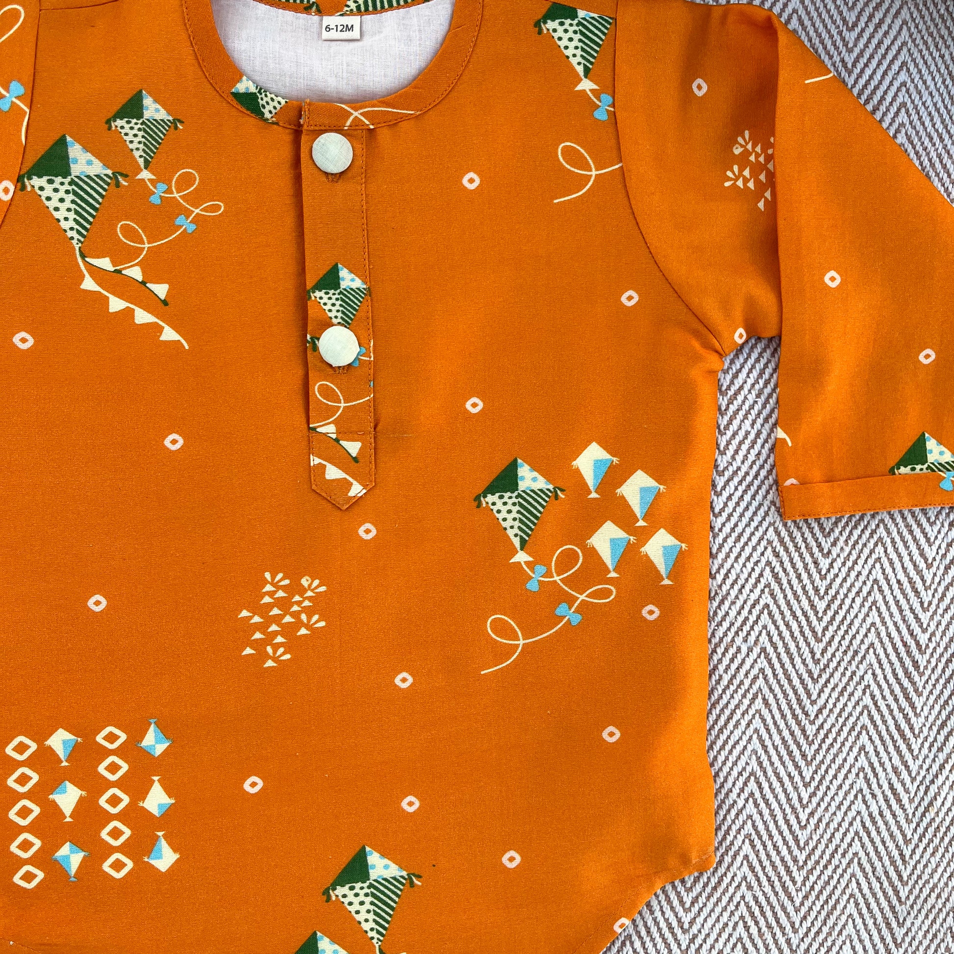 Chanderi Unisex Orange Bandhej Kites Print Kurta